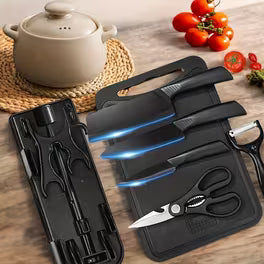 Juego de cuchillos de cocina premium de 7 piezas, fabricados en acero inoxidable con recubrimiento negro para mayor durabilidad y resistencia a la corrosión. Incluye cuchillos esenciales para todo tipo de corte, tijeras multiuso y soporte organizador compacto que ahorra espacio y mantiene la cocina ordenada. Mangos ergonómicos antideslizantes para un manejo seguro y preciso. Ideal para uso diario en el hogar o como regalo práctico y elegante.